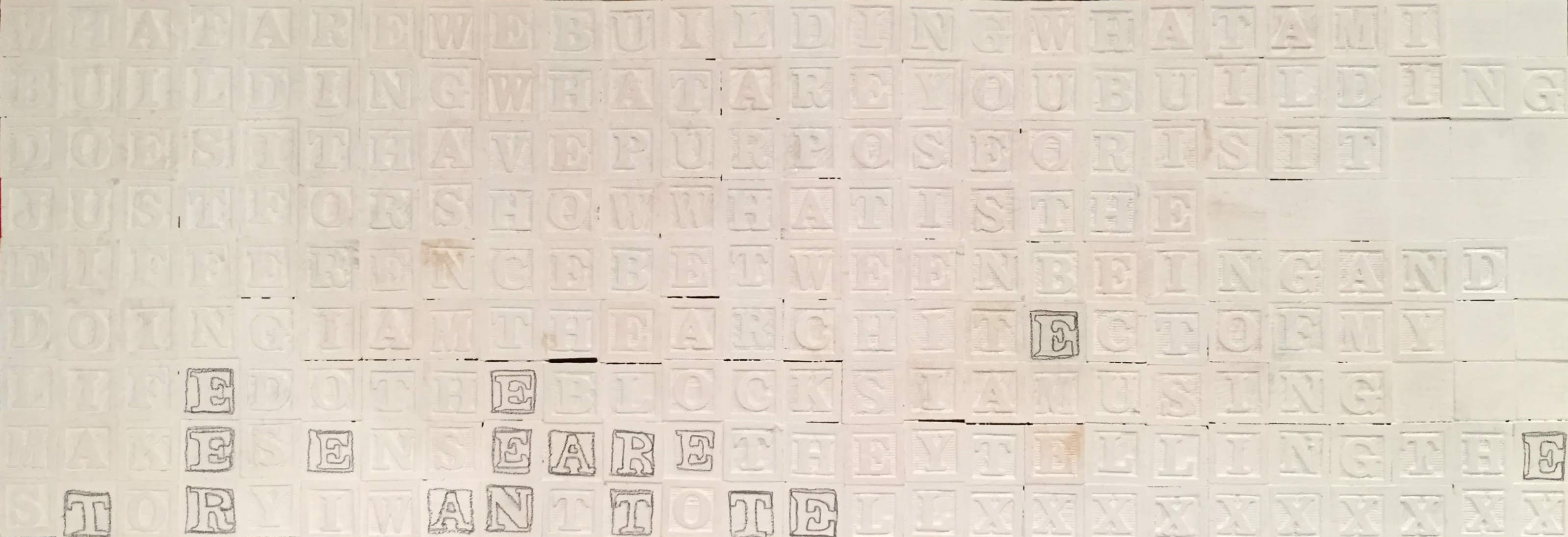 What Are We Building?, recycled letter blocks, acrylic, and pencil on foam board, 10.5 x 30.5 inches, 2013