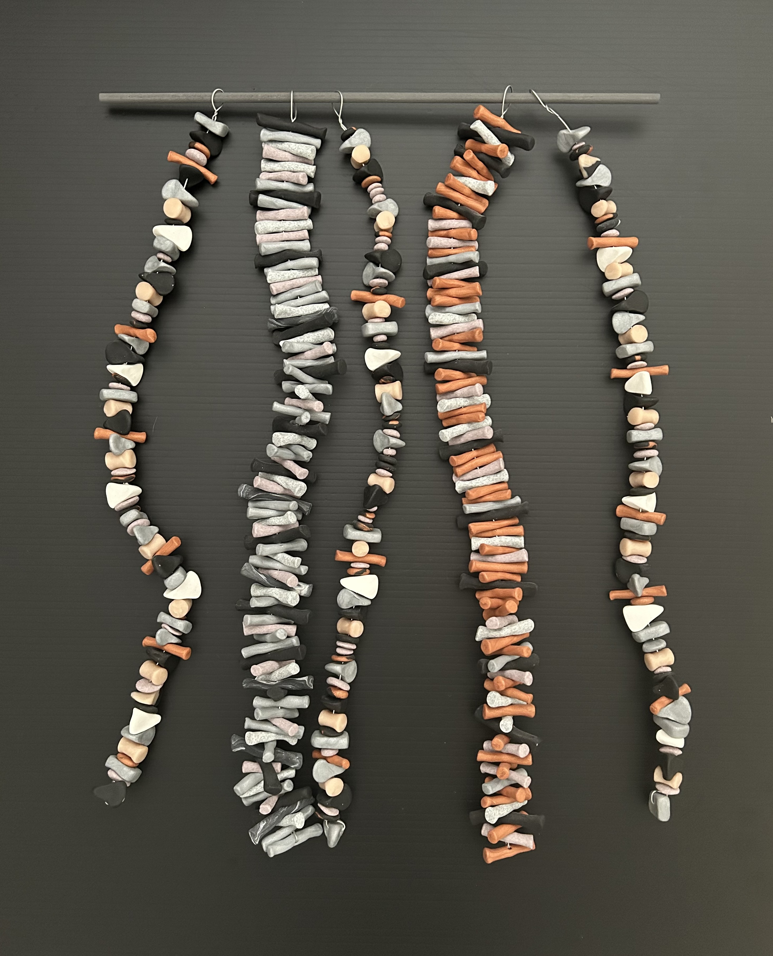 Hand-painted vessels, polymer clay and wire sculpture, felt wreaths