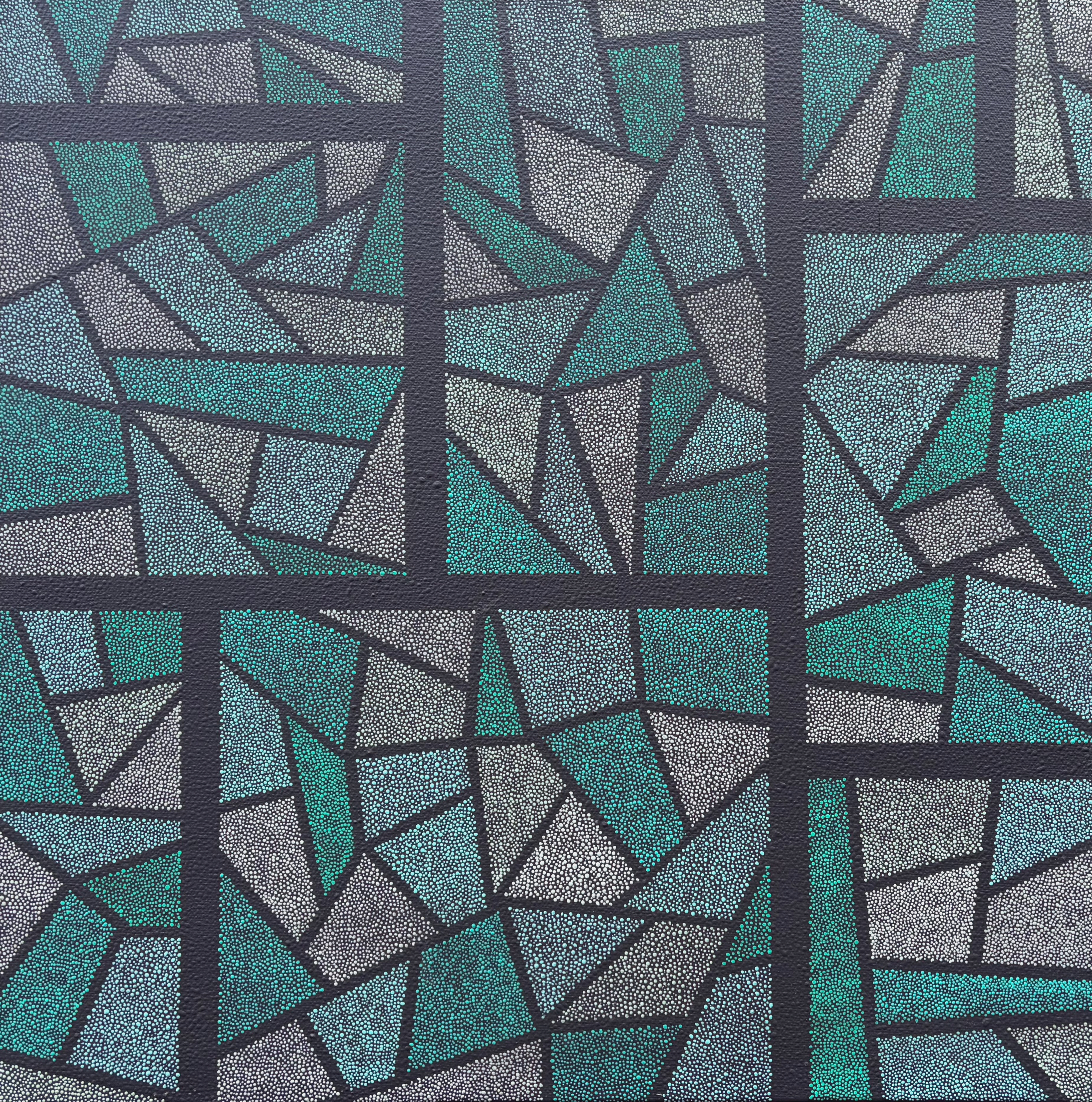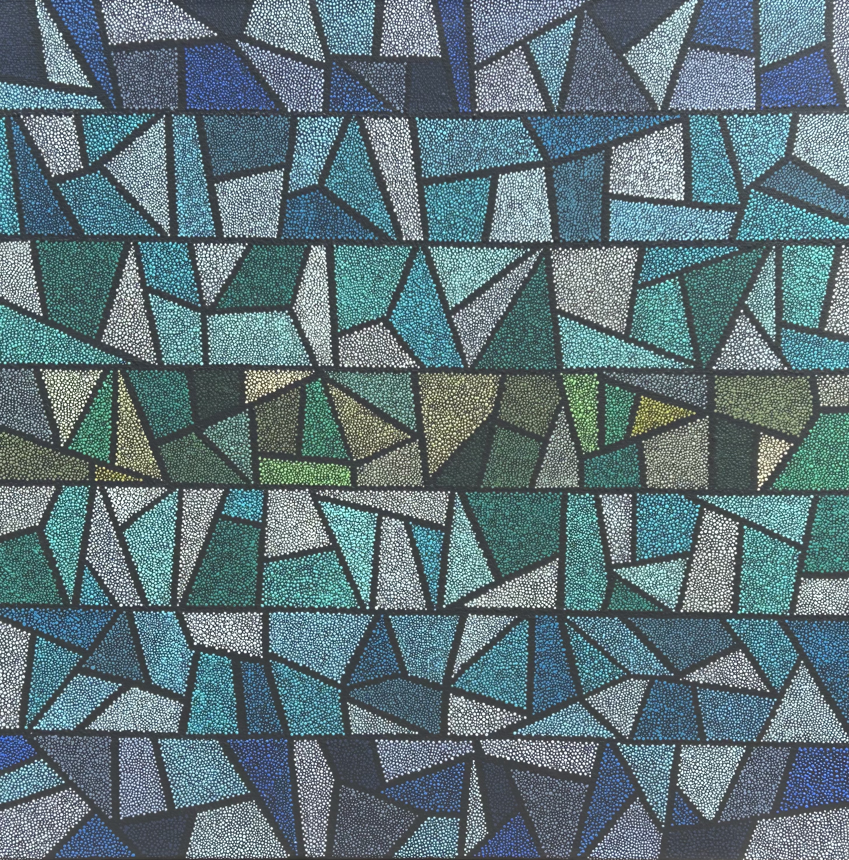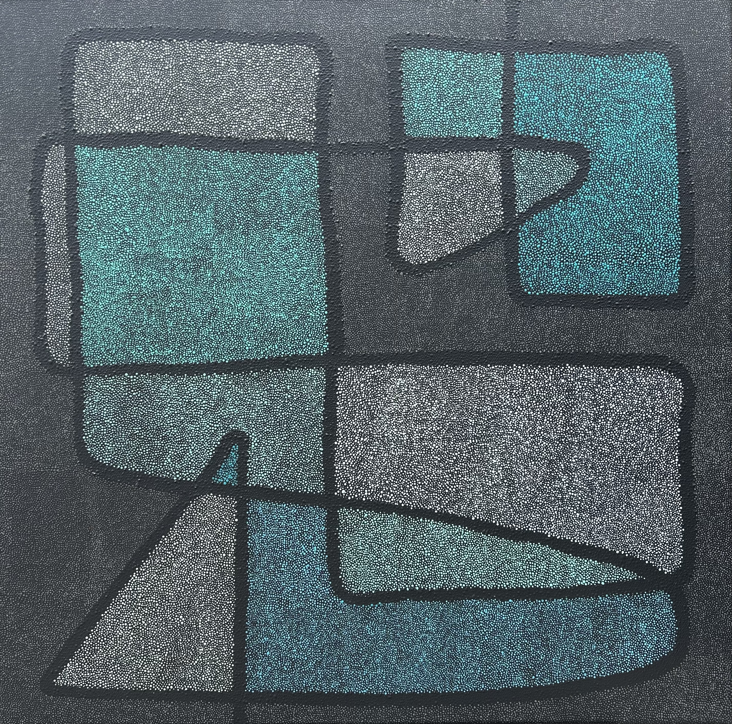 Pieces in Blue and Green, acrylic on canvas (framed), 21x21 inches, 2025