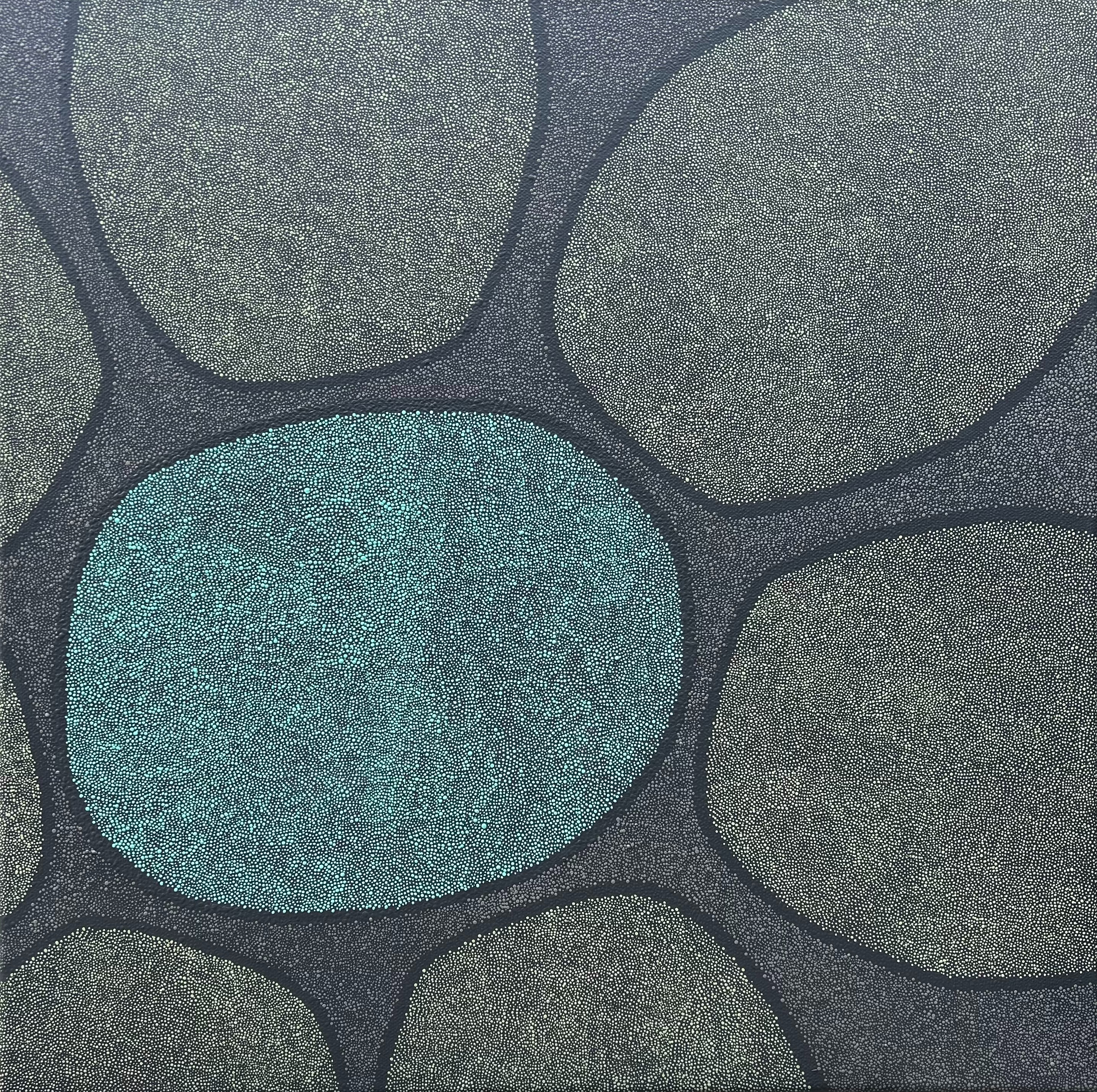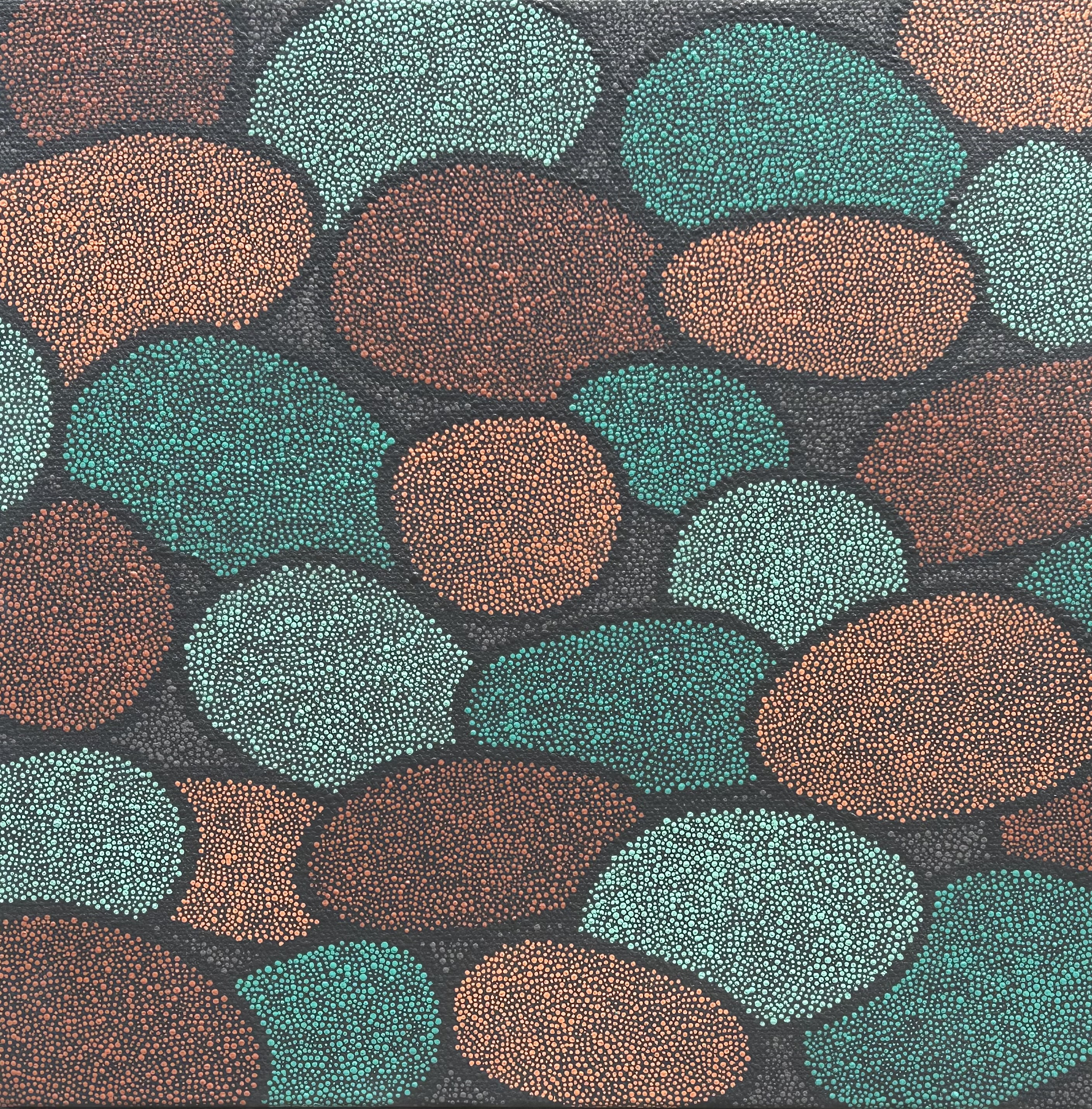 Sienna Jewel River Rocks, acrylic on canvas (framed), 14x14 inches, 2025