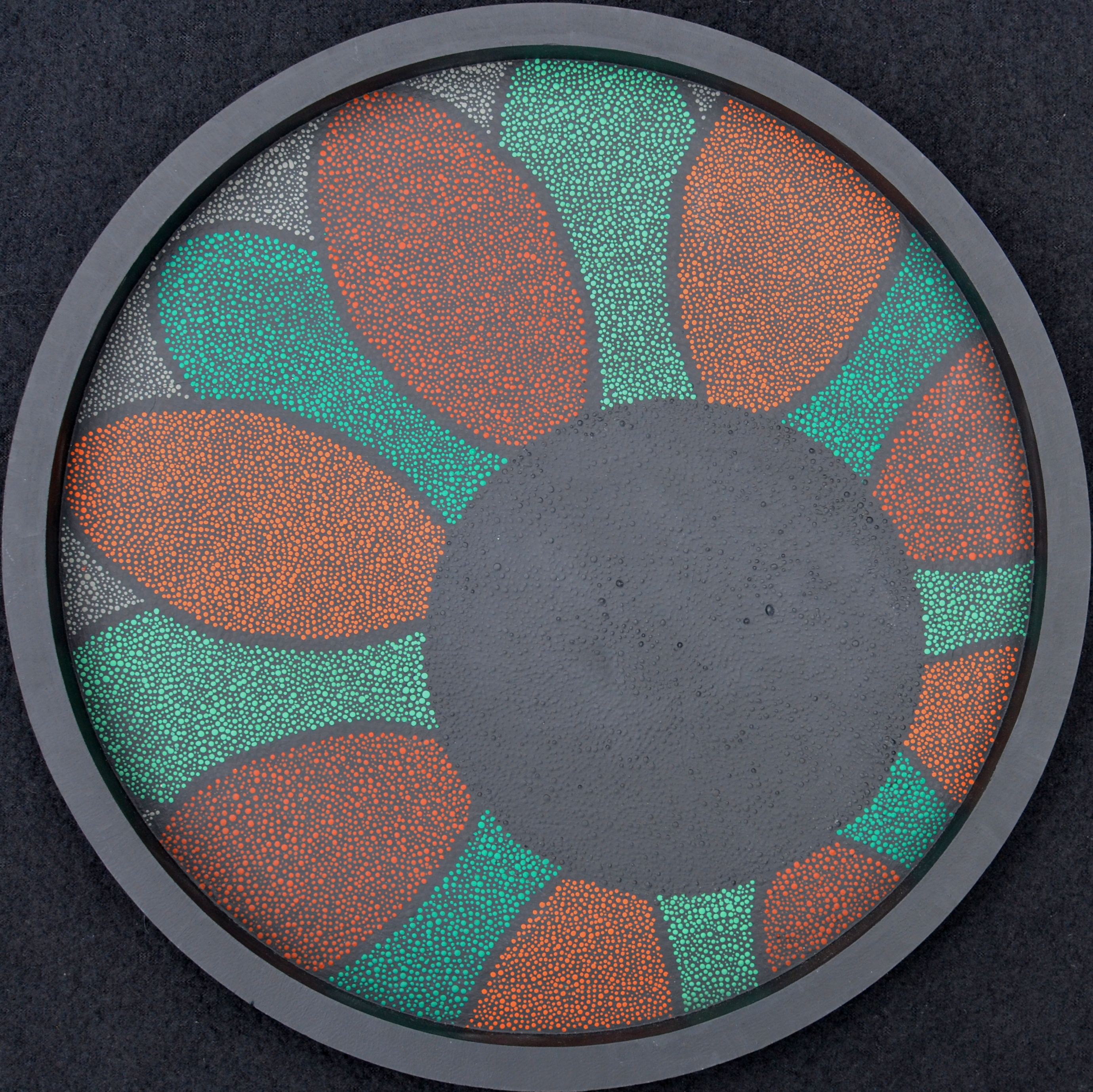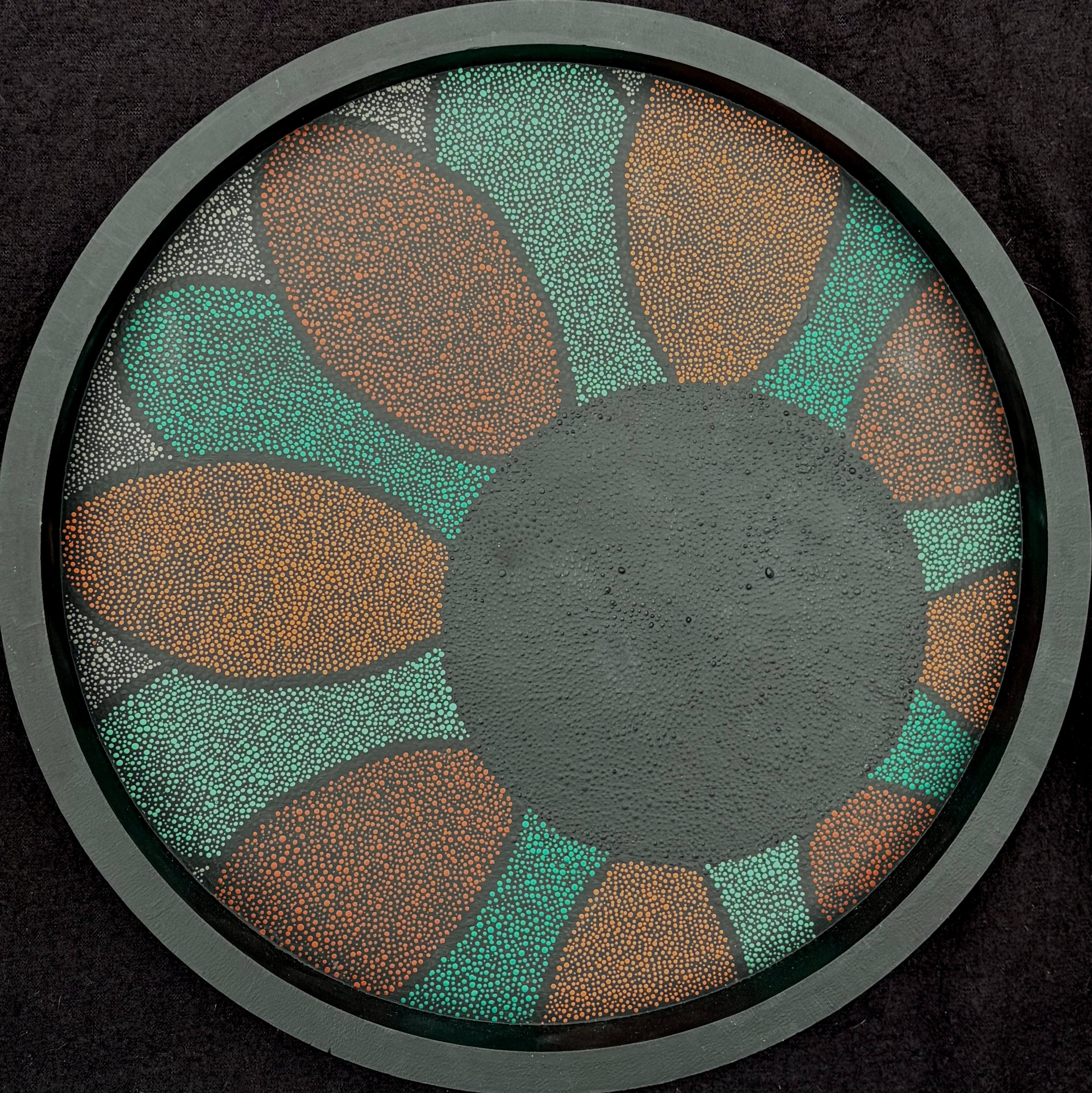 Sienna Jewel Flower, acrylic on wood panel, 12 inches in diameter, 2025
