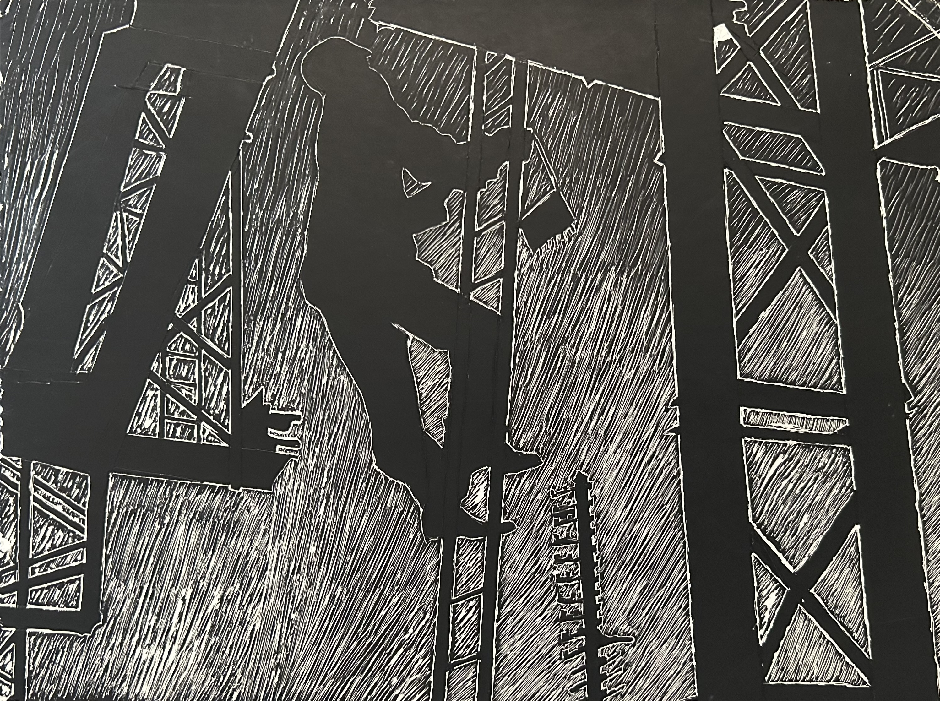 Construction Time Again, scratch board, 6 x 8 inches, 1987