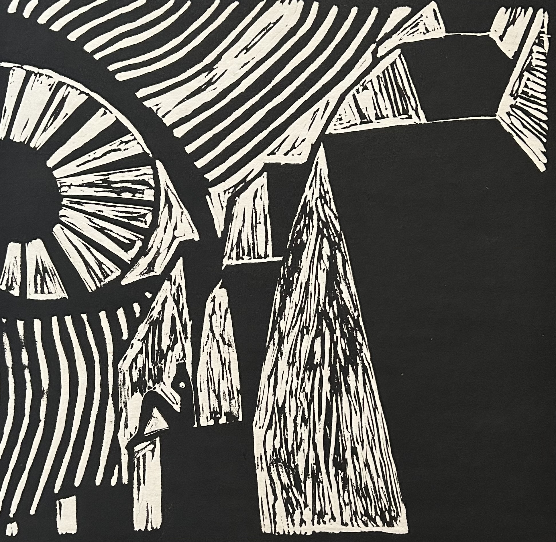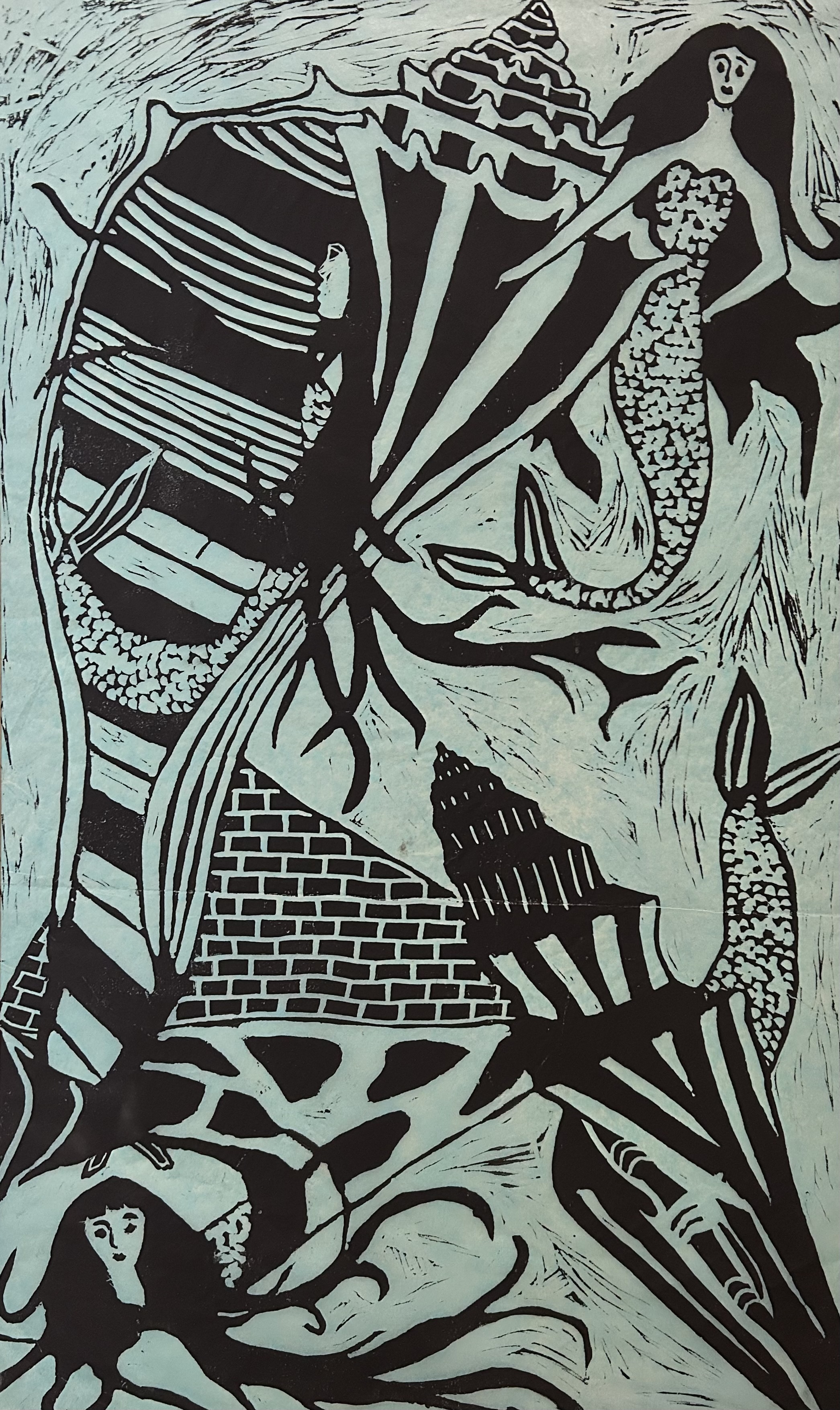 Sirens, linoleum block print (ink) on paper, 21.5 x 14 inches, 1987